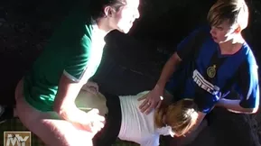 For a hardcore threesome, a young blonde gets it in the car in public.